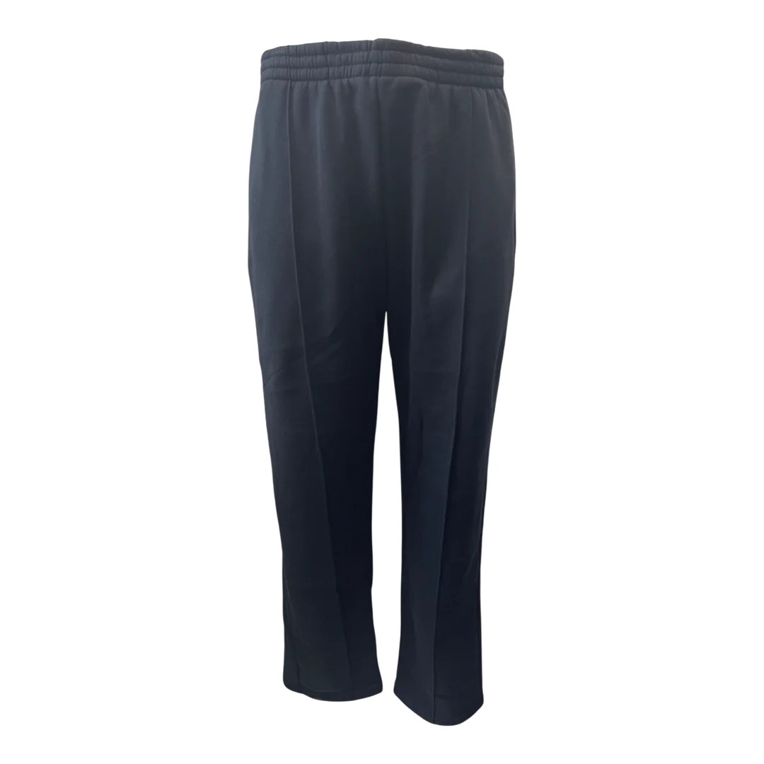 Open leg, elastic waist track pant with a stitched seam running down the front.
