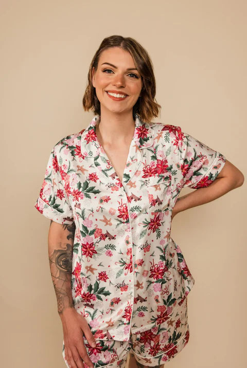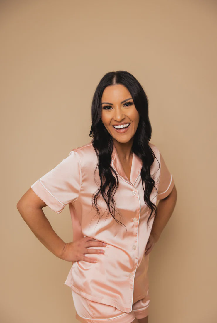 Elevate your loungewear collection with our Short Sleeve PJ Set, an embodiment of femininity, softness, and luxurious comfort. Crafted from high-quality materials, this set is not just sleepwear; it's an experience designed to make you feel special, especially brides during their wedding morning festivities. Wrap yourself in the elegance because you deserve the finest in relaxation.