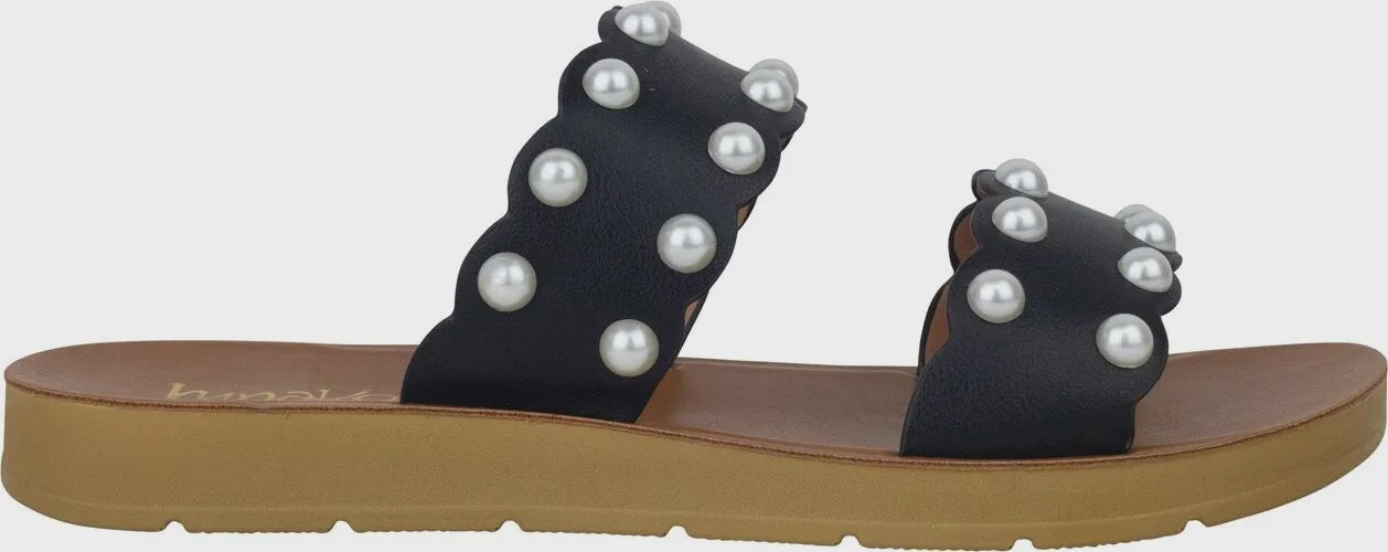 This sandal features a Black strap across the foot with decorative faux pearls embedded in the strap. The pearls are evenly spaced and are attached through circular cutouts in the material, adding a stylish and decorative touch. The overall design is modern and chic, combining the minimalist Black strap with the elegant appearance of pearls. The foot bed is contoured and made from soft, spongy synthetic materials that provides cushioning and comfort