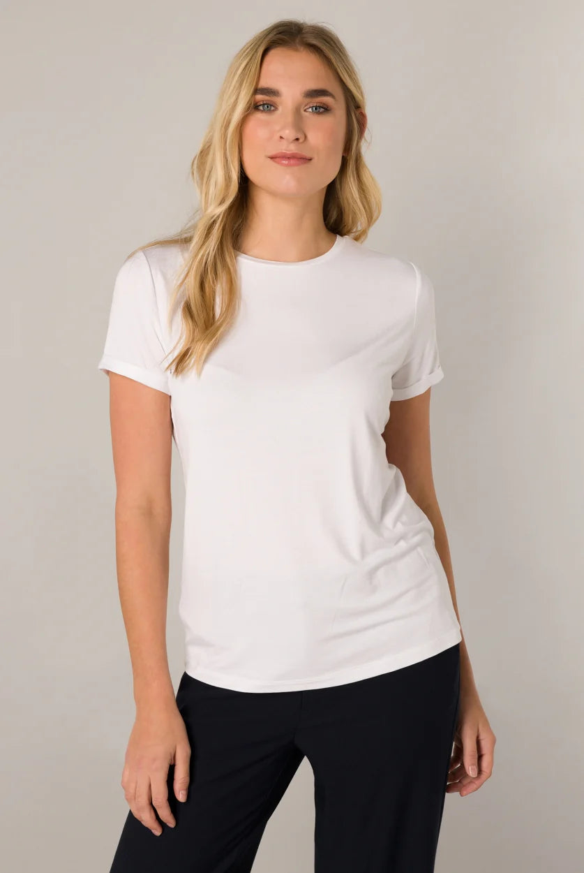 Yalba is a tshirt made of a high-quality viscose blend and available in white, dark blue and black. Yalba has a regular fit fit and has a folded cap sleeve.